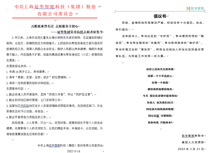 “正視疫情 延華人積極抗疫” 國(guó)家各相關(guān)部門(mén)均發(fā)揮各自職能和專(zhuān)業(yè)優(yōu)勢(shì),調(diào)集資源力量,全力支持上海防控工作,同心協(xié)力盡快打贏這場(chǎng)硬仗;各省份醫(yī)務(wù)人員也聞令而動(dòng),義無(wú)反顧投身抗疫一線;身為這個(gè)國(guó)家、這個(gè)城市的一份子,延華人也在用不同的方式積極抗疫,以健康陽(yáng)光的心態(tài)等待和迎接生活和工作重回正軌。 “同心抗疫,我們一直都在!” 抗疫時(shí)期,延華集團(tuán)黨委及延華新聯(lián)會(huì)齊齊號(hào)召全體延華人積極參與街道防疫志愿工作。人人都是防疫員,個(gè)個(gè)都是戰(zhàn)斗員,面對(duì)這次爆發(fā),我們需要與時(shí)間賽跑,同病毒較量,絕不可掉以輕心,絕不可置身之外,疫情面前,回避沒(méi)有出路,戰(zhàn)勝疫情,責(zé)任同樣不能缺席。