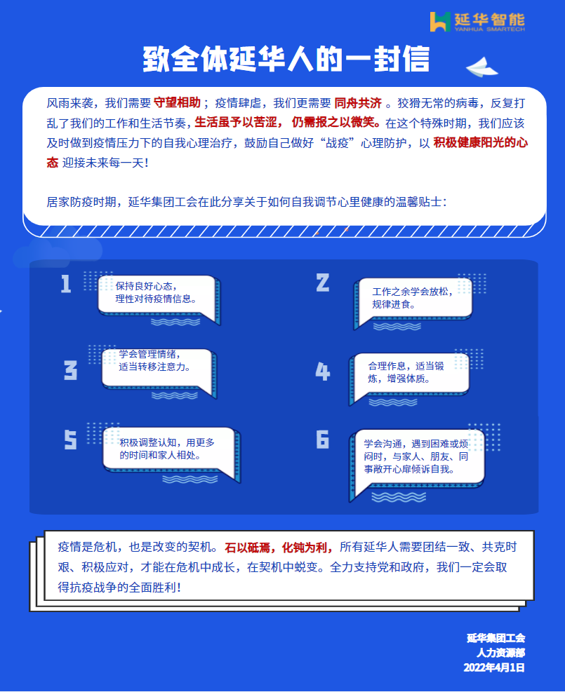 “勿擔(dān)憂,向陽(yáng)而生” 4月1日,延華集團(tuán)工會(huì)聯(lián)合人力資源部再次發(fā)表“致全體延華人的一封信”,全民居家防疫的特殊時(shí)期,大家需要及時(shí)調(diào)整疫情形勢(shì)嚴(yán)峻下的心理壓力,鼓勵(lì)自己做好“戰(zhàn)疫”心理防護(hù),生活雖予以苦澀,仍需報(bào)之以微笑,要以積極健康陽(yáng)光的心態(tài)迎接每一天,所有在沉寂中積蓄的能量,必將會(huì)迎來(lái)最絢爛的綻放。