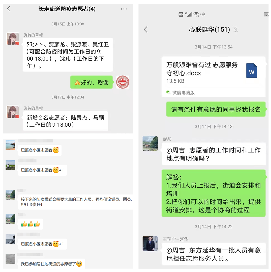 一時(shí)間,收到了來(lái)自各個(gè)部門(mén)同事的踴躍報(bào)名,萬(wàn)眾一心,沒(méi)有翻不過(guò)的山,心手相牽,沒(méi)有跨不過(guò)的坎。是的,這些無(wú)私可愛(ài)的延華志愿者們,正在用他們的方式為城市的復(fù)蘇做著努力。 3月底,隨著疫情防控形勢(shì)日趨嚴(yán)峻復(fù)雜,上海實(shí)施全域靜態(tài)管理防疫政策,而延華人也都為這場(chǎng)沒(méi)有硝煙的戰(zhàn)役時(shí)刻準(zhǔn)備著。在抗擊疫情發(fā)出的倡議書(shū)中寫(xiě)道:全體延華人,積極爭(zhēng)當(dāng)社區(qū)的守護(hù)員、便民利民的配送員、民生服務(wù)的關(guān)愛(ài)員、秩序管理的維護(hù)員、環(huán)境衛(wèi)生的清潔員,為防疫工作發(fā)揮自我價(jià)值和余熱,延華的熱血青年們?cè)缫鸭娂娂尤敫髯跃幼〉刂驹刚叩年?duì)伍中,體現(xiàn)了他們作為黨員、優(yōu)秀青年身上強(qiáng)大的責(zé)任感和使命感。